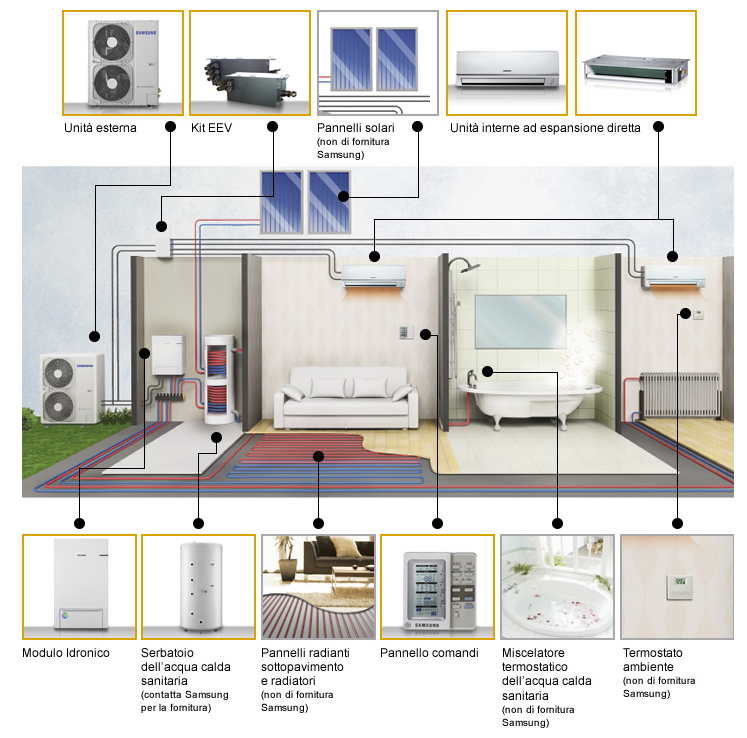 Un solo sistema è quindi in grado di gestire l’impianto radiante a pavimento e gli split o modello